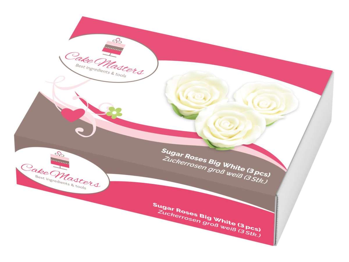 Große weiße Rosen aus Feinzucker; kleine Kunstwerke, welche im Detail ausgearbeitet wurden. Sie bestechen besonders durch ihre edle Verarbeitung und sind vielseitig verwendbar.
